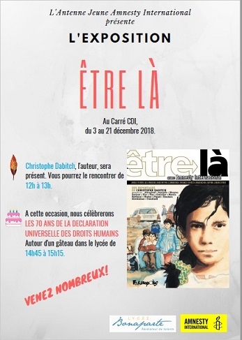 C'est également l'occasion de mettre en exergue un texte fondamental validé par de nombreux pays : la Déclaration Universelle des Droits de l'Homme rédigée en 1948 au lendemain de la Seconde Guerre mondiale. M. Mitrano évoque les différents combats d'Amnesty International dans les pays cités dans Etre là (Syrie, Afrique de l’ouest, Argentine, Japon, Liban, Grèce, Cambodge ...).